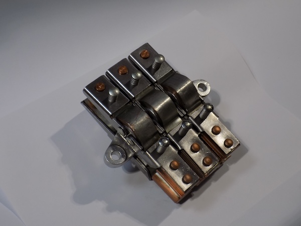 Reverse moving contact assembly for McGraw-Edison 550C tap changers. This mobile component in the reversing switch provides switching action to extend voltage adjustment range without additional tap leads.